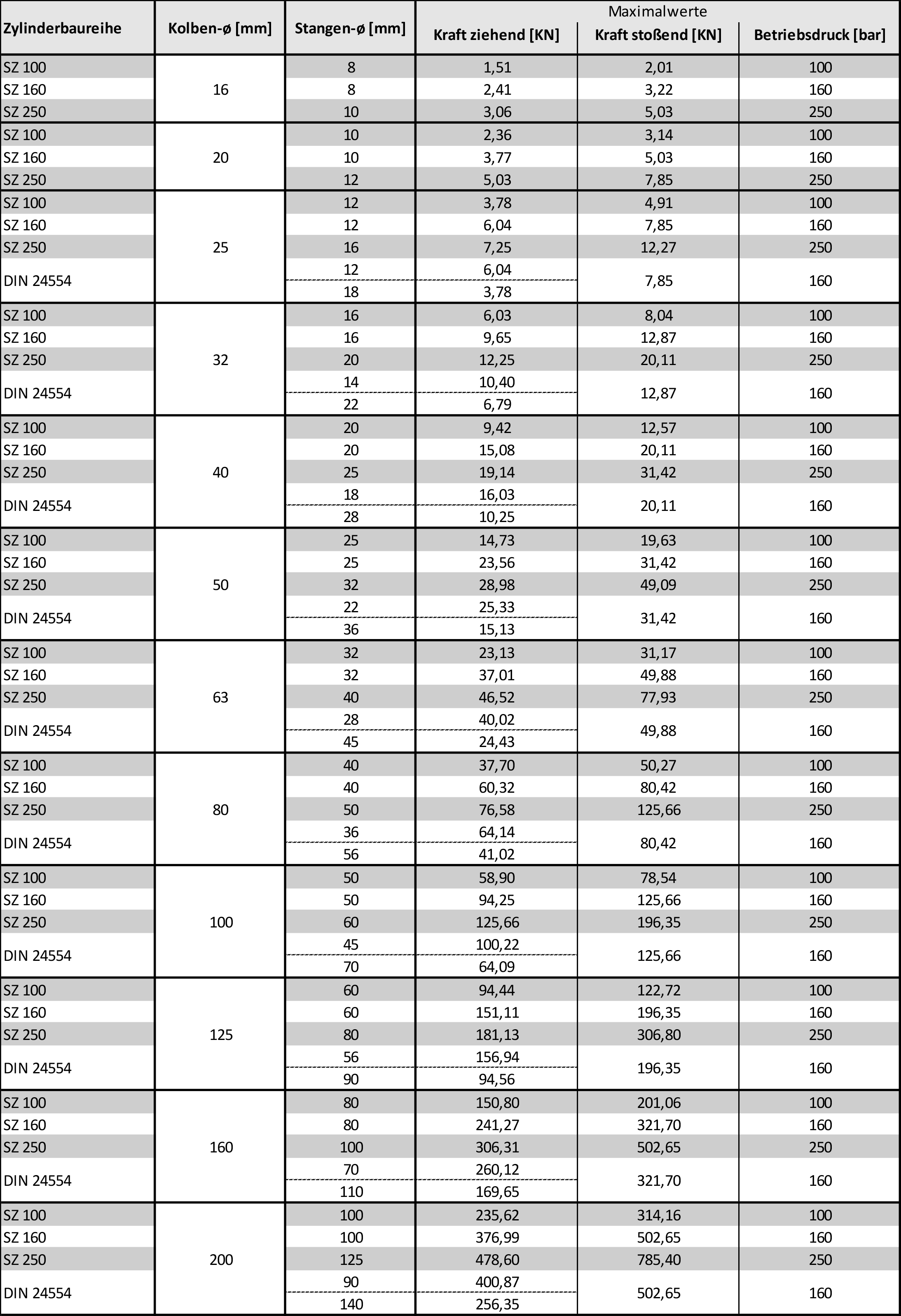 forces / diamètres de tige de piston