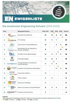 I tillegg til de enkelte teamene kan også utdanningsinstitusjonene deres score poeng i Engineering Newcomer ved å sikre seg en plass på den evige listen med sine unge talenter. Ikke bare samler vinnerne verdifulle poeng til skolene sine, men hvert innsendte bidrag belønnes også med poeng, som samles inn kontinuerlig gjennom alle årene konkurransen pågår. Den utdanningsinstitusjonen som ligger på førsteplass i den samlede rangeringen ved konkurransens slutt, kan se frem til ytterligere 500 euro. I år tok Technikerschule München for fjerde gang på rad førsteplassen i Engineering Newcomer Eternal List.