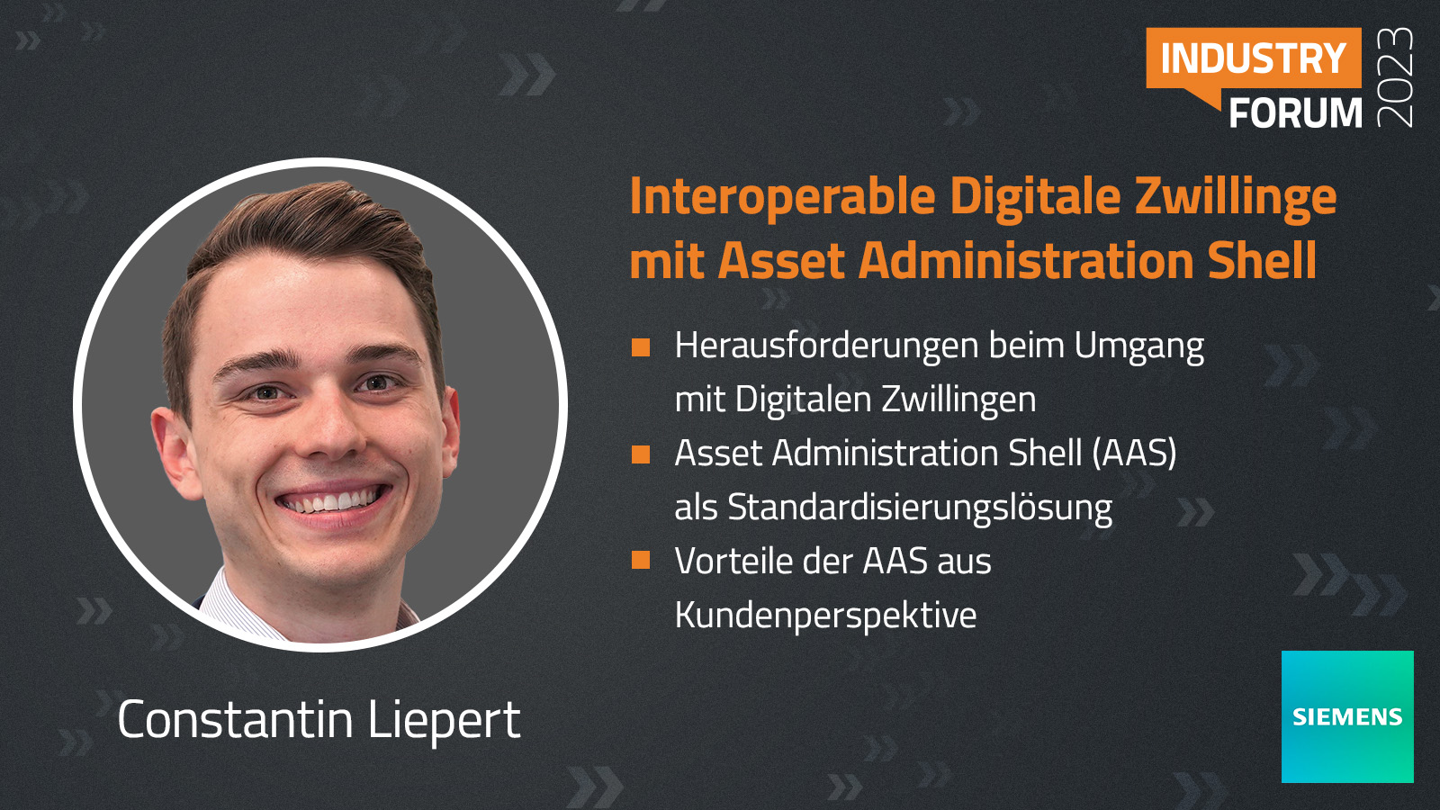 På 21st Industry Forum presenterade Constantin Liepert från Siemens Digital Industries Software sitt paper "Interoperable digital twins through the use of the Asset Administration Shell (AAS): A cross-company AAS use case and its benefits from a customer perspective". I presentationen diskuterade han hur brist på interoperabilitet leder till många problem, användningen av AAS och Siemens mjukvarulösningar samt fördelarna med AAS ur ett kundperspektiv.